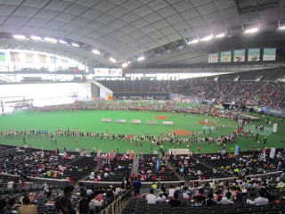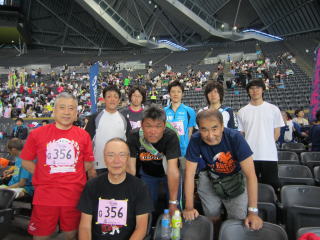 札幌ドームを起点に、ドーム外の天然芝やサブグランドを巡って1周2kmをチームでリレーして、6時間で何周回れるかを競うリレーマラソンに、ラグビー仲間5人と、北海道工業大学の陸上部4人の合同チームで初参加しました。カーペットを敷いているとはいえ日ハムやコンサと同じ人工芝の感触を味わい、応援も含め2万人近い観衆の中を走るのはなかなかの快感です。駅伝であれば1回走れば終わりですが、約1時間後にはまた出番が来て、結局4回走ることになり、妙な疲れ方です。