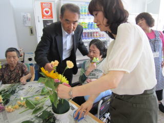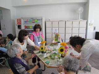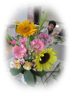 このブログの読者から、アウトドアばかり載っているとのご指摘がありましたので、今回は趣向を変えてフラワーアレンジングです。水を吸わせたスポンジに季節の切花を刺して仕上げるフラワーアレンジングは手軽で初心者にも容易で、女房と月に1回受講しています。手軽で容易とはいうものの、素材は先生があらかじめ買い揃えて戴いているので、それをどのようにアレンジしていくか。ポイントは左右、前後ともアシンメトリー、あまり構えずに大胆にが先生の教えです。