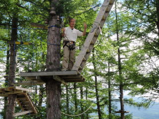 アウトドアは新趣向のツリートレッキングに挑戦しました。これは木々の間を渡した板の上をロープを頼りに空中散歩するものです。バランス感覚の乏しい私でも恐る恐るB難度を踏破。サルやリスはこのような眺めで下界を見下ろしているのかなどと空想する余裕も後半は生まれました。最後は滑車で地上に着陸。この分ならテレビのサスケに出場できるかな?