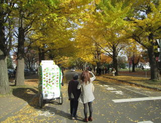 今年は猛暑の影響か紅葉が訪れるのが遅く、11月上旬での北大理学部の蔦ですが、6月に掲載したものと同じアングルで並べてみました。右は北大名所イチョウ並木で11月中旬です。この時期ベロタクシーがキャンパスを巡り、北大サステナビリティー(持続可能な社会)ウィークのシンボルとなっています。