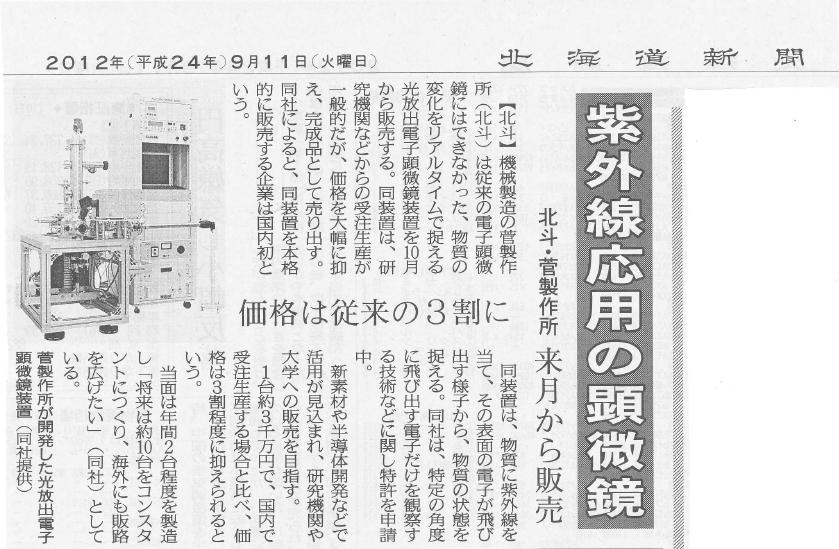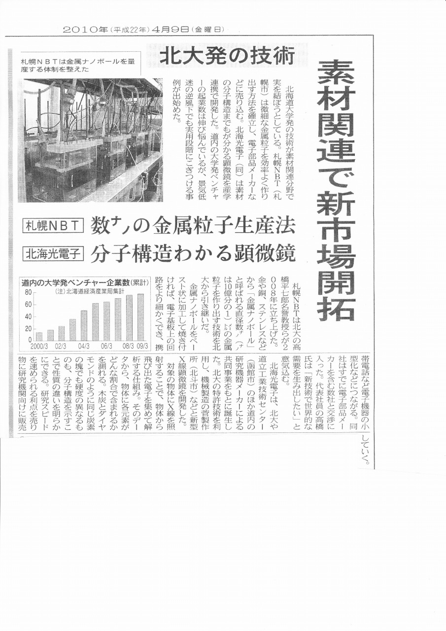 2012年9月 北海道新聞9月11日に新製品発表されました。 2012年6月 日刊工業新聞6月4日 わが社のモットーに掲載されました 2011年7月 東北・関東復興支援企業に登録しました。 展示会出展のお知らせ24. 2012年11月20日(火)〜22日(木) 表面科学学術講演会於 東北大学片平キャンパス http://www.sssj.org/annual/mtg2012/ 23. 2012年11月8日(木)〜9日(金) ビジネスEXPO2012 於アクセス札幌 http://www.noastec.jp/business/ 22. 2012年9月5日(水)〜7日(金) JAISIS2012 於幕張メッセ A6ホール Sー14 http://www.jasis.jp/2012/index.html 21. 2012年2月15〜17日 ナノテク展 於東京ビッグサイト F-02 札幌NBTさんのブースでパネル展示します。 http://www.nanotechexpo.jp/